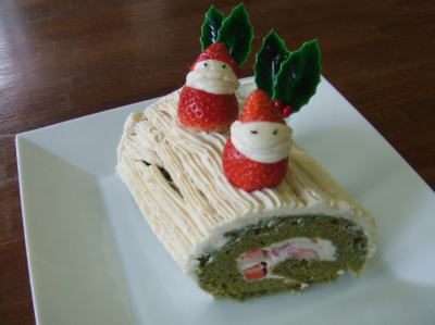 フワフワだけどしっかりと味のする抹茶ジェノワーズに豆腐クリームと苺をサンドしたロールケーキのブッシュドノエルと苺で作ったサンタさんでクリスマス気分!!