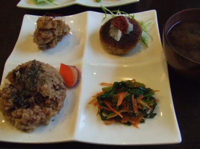 酵素玄米のプレートランチに味噌汁・番茶が付いて1000円。