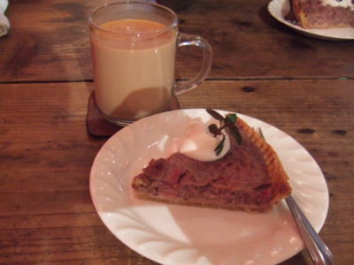 本日のケーキ「金時豆と苺のタルト」とホットチャイ。