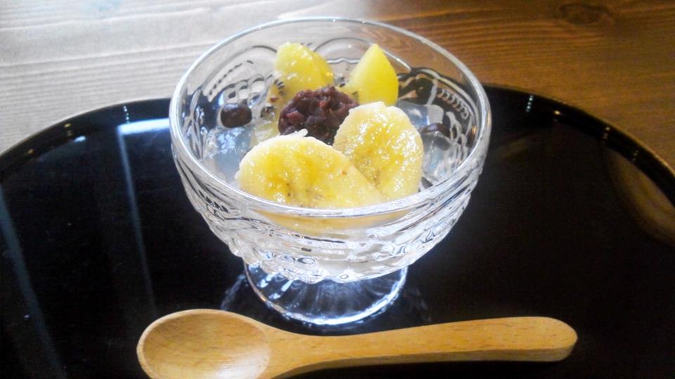 ちゃんと天草の味のするふるふるの寒天と塩えんどう豆と粒あんとフルーツ(バナナとゴールドキュウイ)。